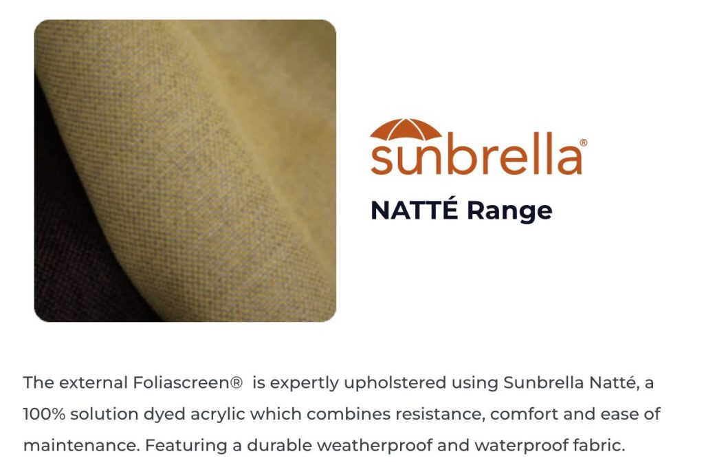 The exterior Foliascreen features the weatherproof Sunbrella Natté fabric, which stands out for its customizable color options. This fabric is not just about aesthetics; it’s about enduring quality.