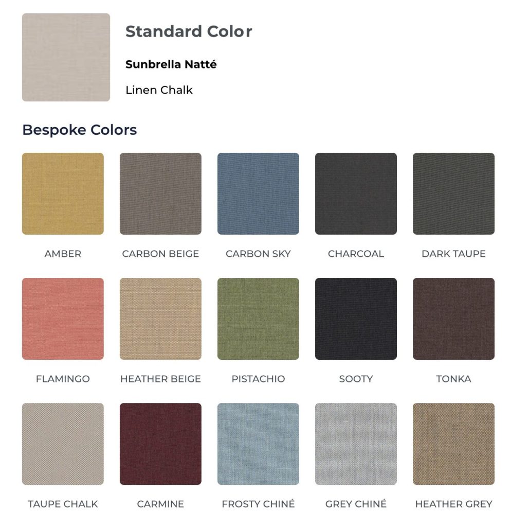 One of the Foliascreen’s key selling points is its customizable color nature. Available in a range of colors, it allows you to tailor its look to match your specific aesthetic preferences. Whether you’re looking for a subtle complement to your existing decor or a bold statement piece, the Foliascreen adapts to your vision. The exterior Foliascreen features Sunbrella fabric. Choose from a range of colors from the Sunbrella Natté collection.